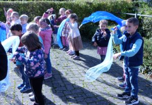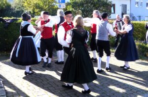 Mit großer Freude singen die Kinder vom farbenfrohen Herbst und tanzen mit den Regentropfen um die Wette. Dies ist allerdings nur sinnbildlich gemeint, schließlich strahlen die Sonne und die Schulanfänger des Bühlertäler Kindergartens St. Marien an diesem Herbsttag um die Wette. Besser hätte die Witterung am Kindertag der Geiserschmiede gar nicht sein können. Daher treten die Kindergartenkinder mit ihren Erzieherinnen und auch die Tanzgemeinschaft Bühlertal/Ottersweier vor dem Museum auf. Bunt und voller Freude sind beide Auftritte. Die Zuschauer sehen gebannt den Darbietungen der kleinen und großen Teilnehmer zu, einige sind sichtlich versucht, bei den Volkstänzen mitzuschwingen. In ihren farbenfrohen Trachten aus Bühlertal und Ottersweier wirbeln die fünf Tanzpaare bei Ziehharmonikaklängen lustig im Kreis herum, so dass die Röcke nur so fliegen.