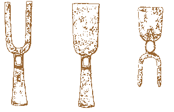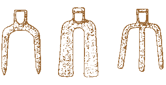 Verwendung: Wird bei der Kartoffel- und Tobinambur-Ernte verwendet. Die drei Zinken sollen das Zerteilen oder Beschädigen der Knolle verhindern. Auch zur Bodenbearbeitung, insbesondere auf steinigen Böden und zur Unterbringung von Dung im Weinberg.