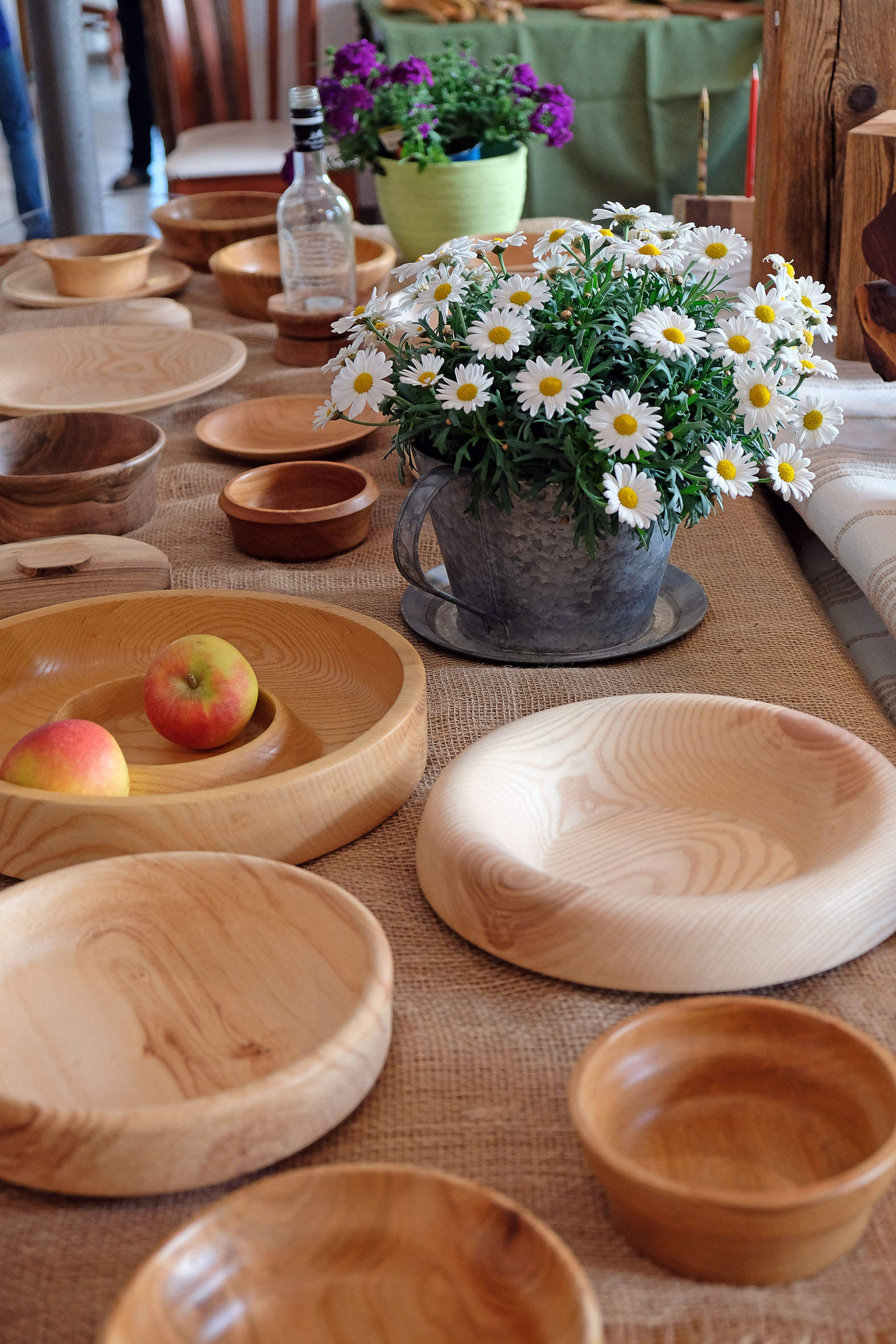 Zum zweiten Mal sind Vertreter der Nagolder Holzwerkstatt zu Besuch. Die weit gereisten Gäste stellen ihre praktischen und formschönen Werke aus, die sie zugleich zum Verkauf anbieten. Angefertigt haben sie Schalen und Schüsselchen, Gewürzmühlen, Kugelschreiber, Ketten und allerlei mehr. Die Teilnehmer lassen sich zudem beim Drechseln und bei der Herstellung von Holzketten über die Schultern schauen.