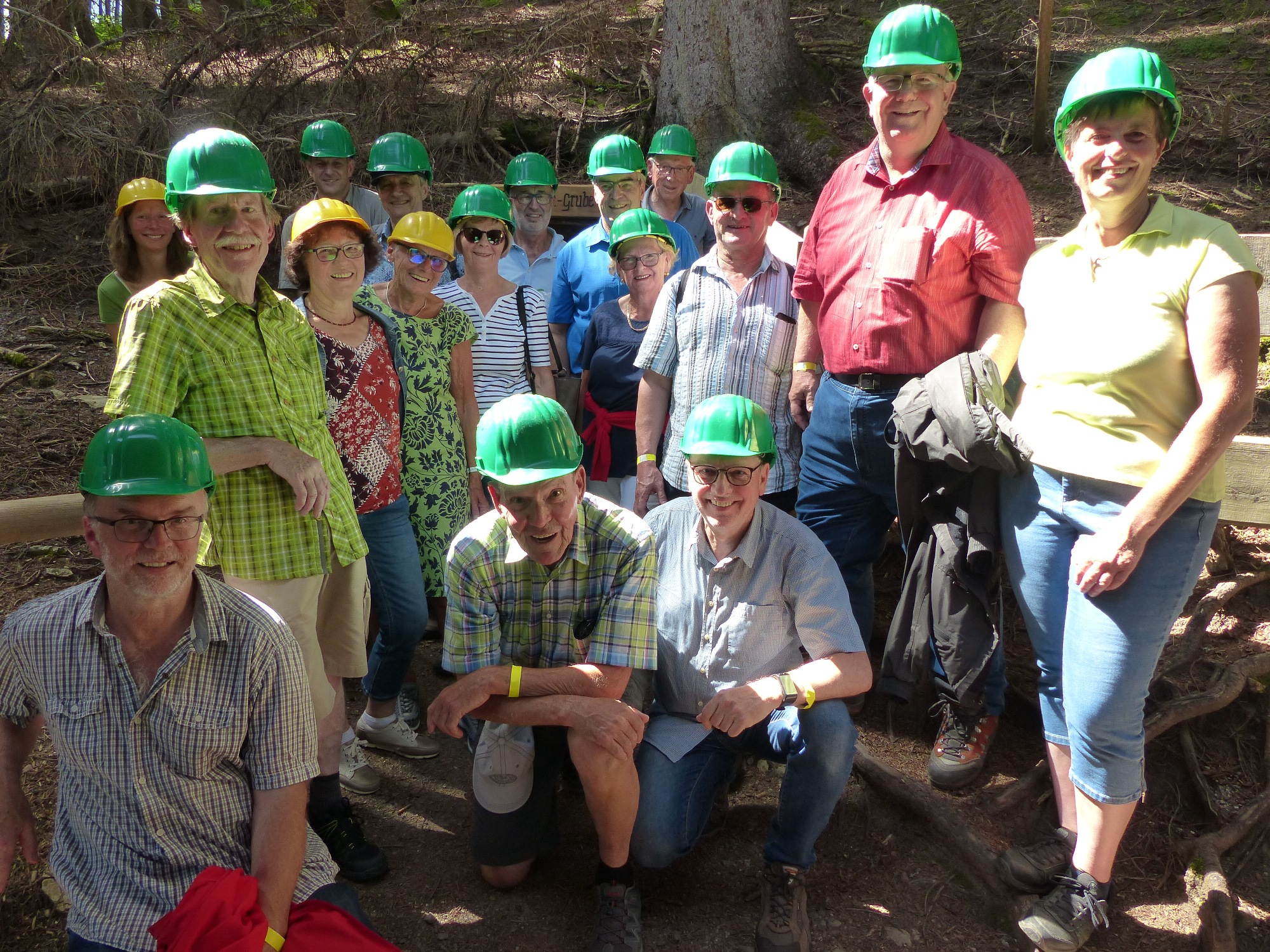Bei sengender Hitze geht es eine Stunde lang den Berg hinauf. Gelegentlich spenden Bäume gnädig ein wenig Schatten. Dennoch macht sich ein Großteil des ehrenamtlichen Helferteams in fröhlicher und erwartungsvoller Stimmung zusammen mit den Vereinsvorsitzenden Hans-Peter Braun und Tino Rettig, Vereinskassier Edgar Karcher, Museumsleiterin Ina Stirm und zahlreichen Ehepartnern auf den beschwerlichen Weg. Und werden belohnt durch einen wunderbar informativen, eindrucksvollen und kühlen Einblick in das Leben unter Tage. Hier schufteten einst zahlreiche Bergmänner und verdienten sich mit dem Abbau von Erz in annähernder Dunkelheit, bei Nässe, Enge und Kälte ihren kargen Lohn. Kaum vorstellbar für die Besucher von heute. Besichtigt wird die „Erzgruben Erlebniswelt Grünten“, die neben mehrerer Erzgruben ein Museumsdorf und eine gemütliche Einkehrstube beheimatet. Ein schöner Auftakt des Ausfluges ins Allgäu, der auch als Dankeschön für die zahlreichen geleisteten Arbeitsstunden vor Eröffnung der neuen Dauerausstellung im Januar diesen Jahres auf zwei Tage angesetzt war.
