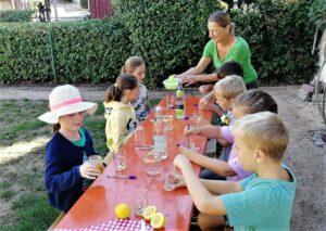Die sieben Kinder sitzen und rühren und rühren. Anschließend schlecken sie mit sichtlichem Genuss den verbliebenen Honig vom Löffel. Als Limonade schmeckt es gleich noch einmal so gut und macht neugierig auf die kommenden zwei Stunden.