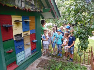 Dabei haben sie unter anderem erfahren, dass Bienen das Wachs, diesen tollen Baustoff, selbst produzieren, und dass sie für ein Glas Honig „3 Mal um die Erde“ fliegen müssen. Mit großem Interesse haben sie in den Bienenstock geschaut und geraten, wie viele Bienen darin leben. Auch was für Bienenarten es in einem Bienenvolk gibt und was für „Berufe“ sie in Ihrem Leben ausüben.