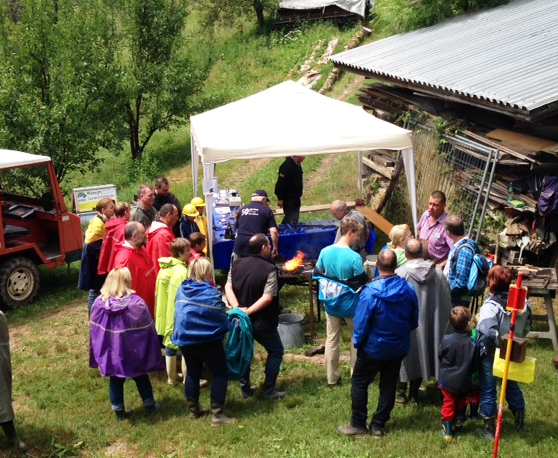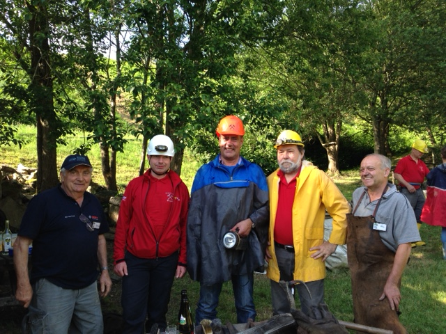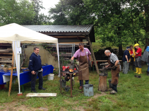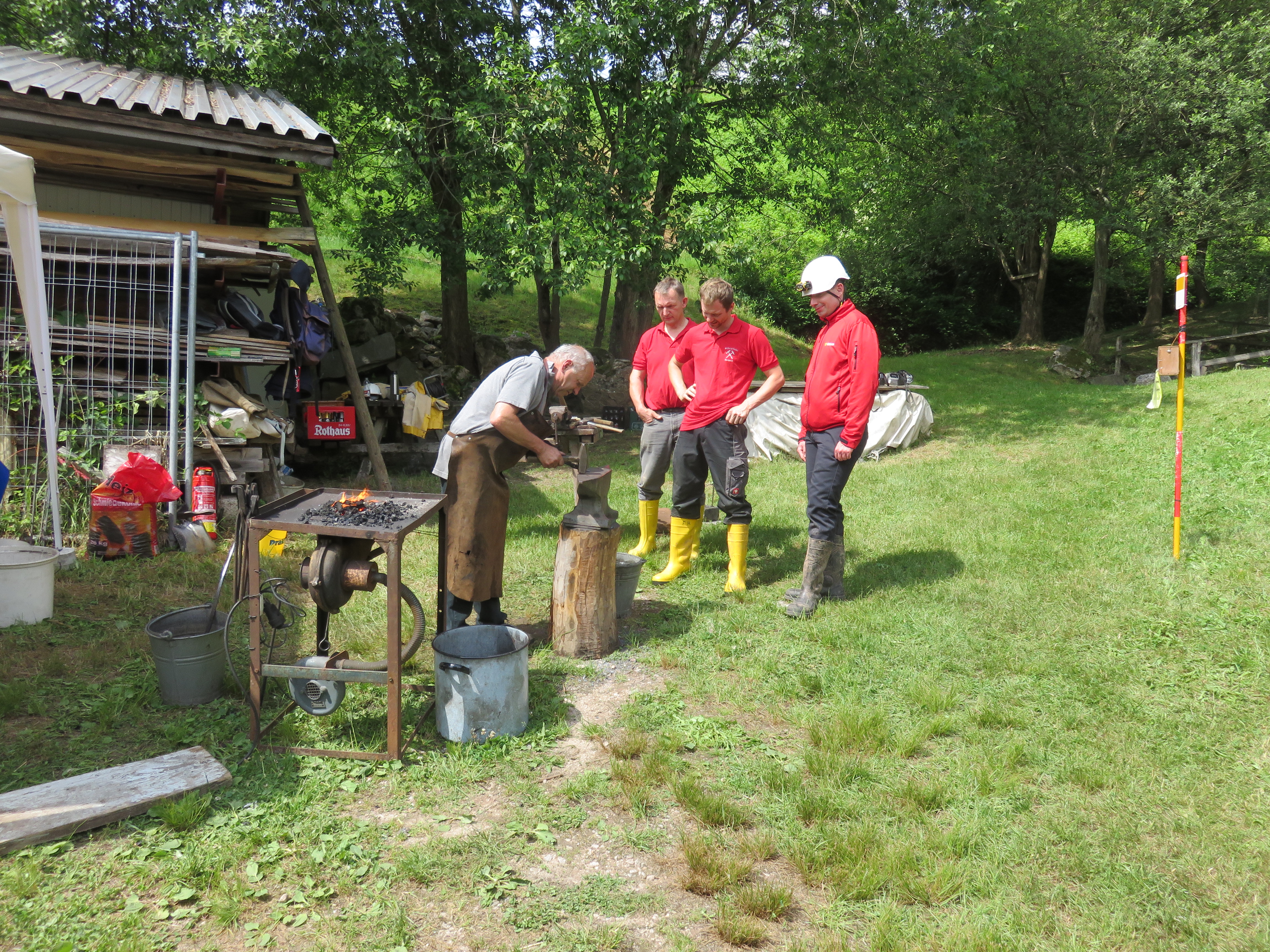Diese historische Verbindung lebte an Pfingstmontag im Besucherbergwerk Silbergründle im Achertal wieder auf. Einige Helfer des Bühlertäler Museum Geiserschmiede packten ihre „sieben Sachen“ und unterstützten das Helferteam des Bergwerkes. Sie platzierten ihre Feldschmiede vor dem Stolleneingang, an dem sich die Besucher, ausgerüstet mit Helm, Gummistiefeln und Regenjacke auf die Führungen durch das Berginnere vorbereiteten.
