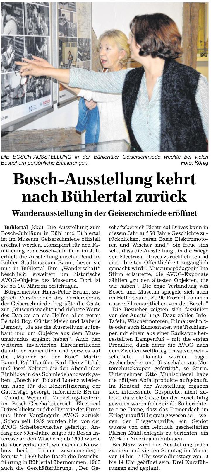 Die Ausstellung wurde eröffnet mit einer Begrüßung durch den Bühlertäler Bürgermeister und 1. Vorsitzenden des Fördervereins Museum Geiserschmiede Hans-Peter Braun. Anschließend richtete Frau Claudia Weyandt, Leiterin Marketing Geschäftsbereich Electrical Drives, Robert Bosch GmbH einige Worte an die Besucher.