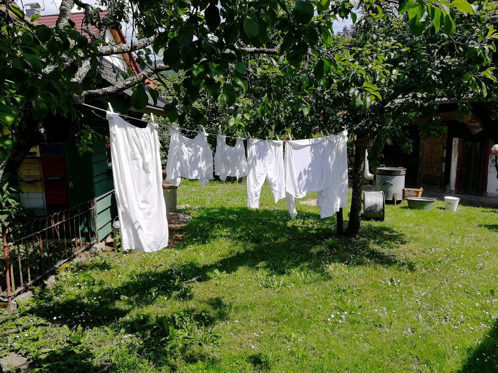 Im Alltagskleid und mit den schweren Holzschuhen an den Füßen tritt sie geräuschvoll aus der Waschküche. Im Weidenkorb trägt sie die Wäsche zum bereitstehenden Waschzuber im Garten. Schließlich scheint heute die Sonne und das kräftezehrende und zeitraubende Wäschewaschen kann im Freien und muss nicht in der beengten Waschküche erfolgen.